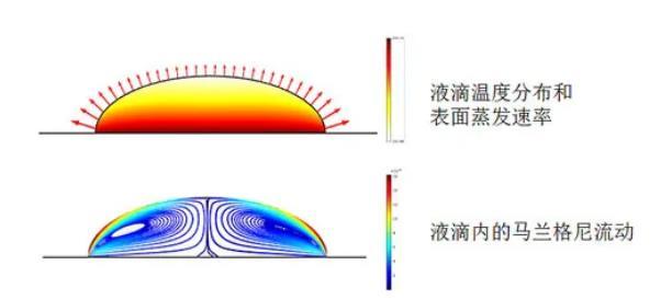 -液滴蒸發(fā)過程:液滴在蒸發(fā)過程中,邊緣處的溶質(zhì)濃度增加或溫度下降可能導致表面張力增大,形成向中心的馬蘭格尼流,影響蒸發(fā)速率和液滴形態(tài)演化。