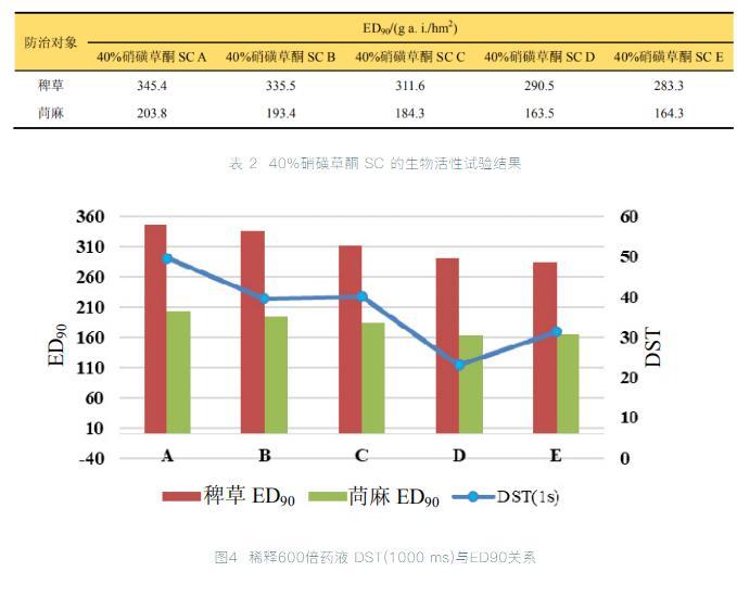 通過對480 g/L硝磺草酮懸浮體系制劑的研究,進(jìn)而測定5個不同制劑配方的3種稀釋濃度液的動態(tài)表面張力,研究防治效果與動態(tài)表面張力的關(guān)系。結(jié)果顯示無論對禾本科還是闊葉雜草,懸浮體系藥液的動態(tài)表面張力的變化趨勢,在一定程度上與其藥效正相關(guān)。