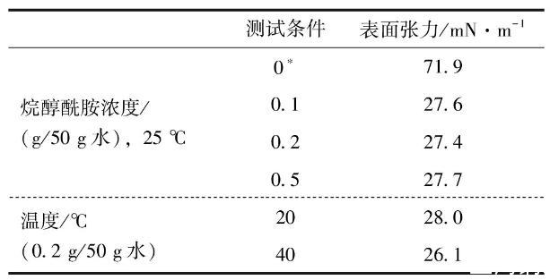 表1自制烷醇酰胺不同測試條件下表面張力