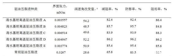mN/m,潤濕角改變值≥40°,減阻率≥70%,防膨率≥90%,阻垢率≥80%。從表2中數(shù)據(jù)可以看出,新研究的海水基耐高溫驅(qū)油壓裂液,在實(shí)驗(yàn)溫度180℃條件下,各項(xiàng)指標(biāo)均達(dá)到海上油田的要求;在相同條件下,其界面張力值、潤濕角改變值、減阻率、防膨率、阻垢率均優(yōu)于常規(guī)驅(qū)油壓裂液產(chǎn)品。
