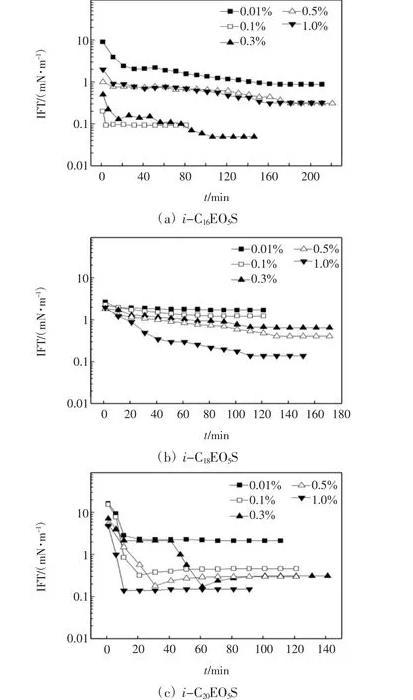 (1)本文研究的3種支鏈化脂肪醇聚氧乙烯醚磺酸鹽具有一定的降低界面張力活性,界面張力可達10-2mN/m數(shù)量級。