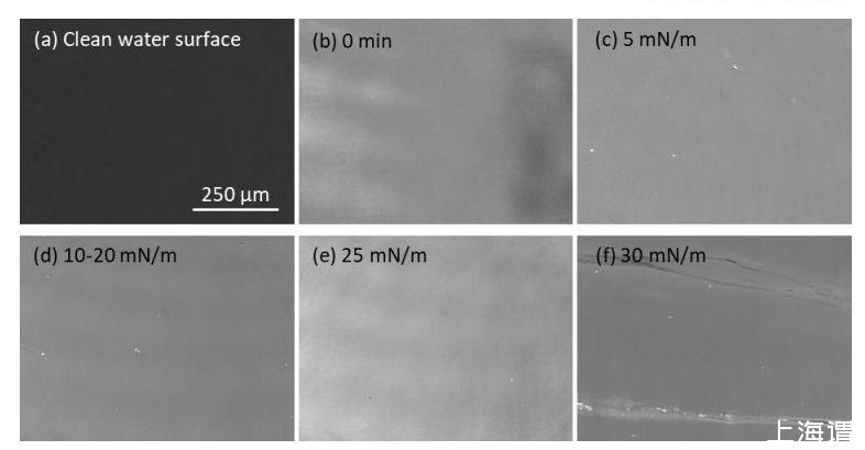 圖3、空氣-水界面處的FhuA膜BAM(布呂斯特角顯微鏡)圖。(a)在MPD緩沖液中擴(kuò)散FhuA WT之前和(b)之后的Langmuir槽氣-水界面BAM圖像;和(c-f)在不同表面壓力下的屏障壓縮。涂敷后立即在空氣-水界面上吸附一層致密均勻的FhuA WT膜。FhuA WT膜可以被壓縮到高達(dá)25 mN/m的表面壓力,而不會(huì)表現(xiàn)出不均勻性。在表面壓力為30 mN/m時(shí),在FhuA WT薄膜中可以看到垂直于壓縮方向的細(xì)長(zhǎng)裂紋。