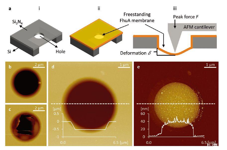 圖4、在FhuA單層膜上的AFM測(cè)量.a)當(dāng)(i)未覆蓋和(ii)覆蓋有FhuA膜時(shí)在其中心具有單個(gè)孔的氮化硅膜窗口的示意圖.(iii)在PeakForce QNM模式下AFM成像期間FhuA膜涂覆的氮化硅膜窗口的橫截面(b-d)當(dāng)(b)孔未被FhuA膜覆蓋,(c)孔被破裂的FhuAΔCVF膜覆蓋時(shí),氮化硅膜窗口中的孔的AFM高度圖像膜,和(d)孔被一個(gè)完整的FhuAΔCVFtev膜層覆蓋(d)和(e)中的高度和變形圖像是同時(shí)獲得的,并且所有圖像都是在水中測(cè)量的。(d)和(e)中的高度和變形曲線分別屬于圖像中的虛線。