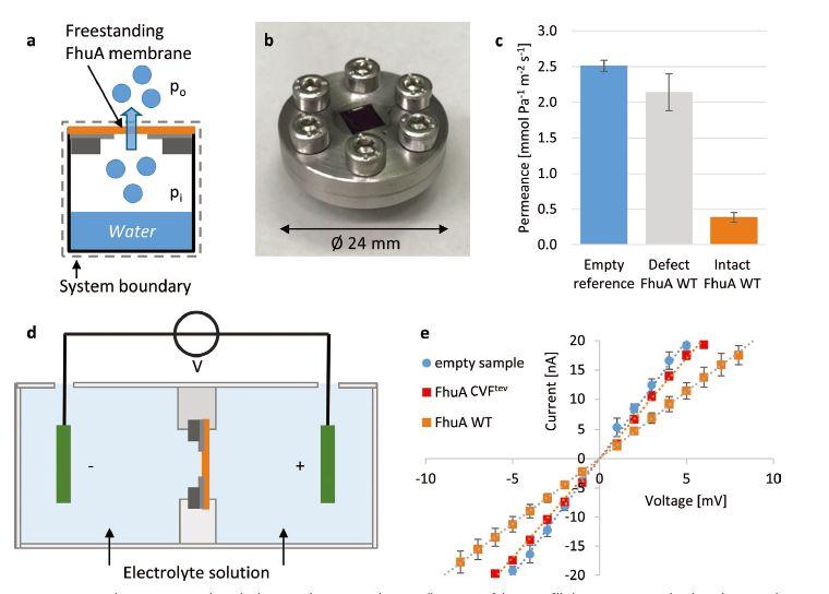 圖5、通過FhuA膜的水和離子滲透。a)覆蓋有氮化硅膜窗口的充水容器的示意圖,其用于測(cè)量FhuA WT膜的水滲透。由從杯內(nèi)到杯外的水蒸氣壓差驅(qū)動(dòng)(pi-p0)(a)中所示的杯子的照片。c)FhuA WT膜的水滲透性為3.87×104 mol Pa-1 m?2 s-1(空參考25.13×104 mol Pa-1 m?2 s-1誤差條表示至少三個(gè)樣品的平均值的標(biāo)準(zhǔn)誤差。d)用于測(cè)量FhuA膜的離子滲透性的實(shí)驗(yàn)裝置的示意圖。離子在電極之間擴(kuò)散的唯一方式是滲透氮化硅膜窗口中的孔頂部的FhuA膜。e)在磷酸鹽緩沖液(10×10?3 m NaCl,10×10?3 m恒定斜率對(duì)應(yīng)于4.0mS(空參比)、3.4mS(FhuA?CVF)、3.4mS(FhuA?CVF)和3.4mS(FhuA?CVF)的電極之間的恒定電導(dǎo).