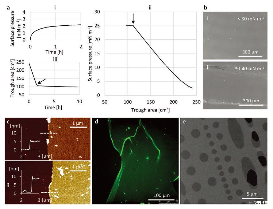 圖2、a)在空氣-水界面處的FhuA膜并轉(zhuǎn)移到基底上。(i)吸附,(ii)壓縮,和(iii)在膜制造期間從0.32nmol FhuA WT涂布在磷酸鹽緩沖液頂部測(cè)量的谷面積-時(shí)間曲線在(ii)和(iii)中,戊二醛的注射用箭頭標(biāo)記。B)相應(yīng)的BAM成像顯示(i)在高達(dá)30 mN/m的表面壓力下均質(zhì)的FhuA膜-1.(ii)表面壓力超逾30mN/m)(i)一個(gè)或(ii)兩個(gè)FhuA膜片的AFM圖像,所述膜片層疊在硅基底的頂部上(左半部分用注射器尖端刮去)。高度分布屬于圖像中的虛線,并且指示(i)5和(ii)9 nm的膜厚度。d)單個(gè)FhuAΔCVF的共聚焦熒光顯微鏡圖像,用熒光標(biāo)記物標(biāo)記的硅襯底上的薄膜片e)獨(dú)立地覆蓋TEM網(wǎng)格(淺灰色)的結(jié)構(gòu)化碳膜中的孔(深灰色)的FhuA WT膜的HIM圖像。黑色區(qū)域顯示膜中的缺陷。