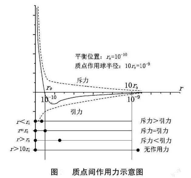 由熔體作用力理論可知,組成熔體的質(zhì)點間存在著作用力。當質(zhì)點處于平衡位置時,即質(zhì)點間距r=r0(r0=10-10)時,引力等于斥力,質(zhì)點間作用力為0;質(zhì)點間距r>r0,作用力為引力;質(zhì)點間距r<r0,作用力為斥力;當質(zhì)點間距r>10r0時,引力和斥力均為0,如上圖所示。