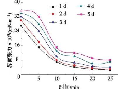 驅(qū)油體系在巖石表面的吸附損耗量越高,驅(qū)油成本就越高。因此,考察DQ-2在不同老化時間條件下體系的穩(wěn)定性和界面性能,具體實驗方法參見1.4.4吸附性能測定,實驗結(jié)果見圖5。隨著巖心吸附時間的延長,油水界面張力逐漸增大,但均可達到10-3級別。實驗得出,巖心對該體系具有一定的吸附作用,但吸附量比較少,同時巖心對該體系的界面張力影響較小。體系DQ-2具有良好的吸附穩(wěn)定性。