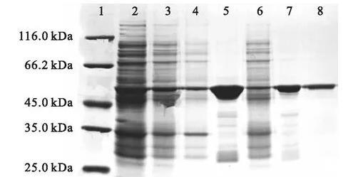 圖1失活型VhPLD的表達(dá)與純化SDS-PAGE電泳圖注:1.蛋白marker;2.菌體破碎液;3.菌體破碎后離心所得上清液;4.菌體破碎后離心所得沉淀;5.鎳柱純化所得100 mmol/L咪唑洗脫峰樣品;6.鎳柱純化的上樣穿過(guò)峰樣品;7.G-25柱純化的洗脫峰樣品;8.Q柱純化的300 mmol/L氯化鈉梯度洗脫峰樣品。