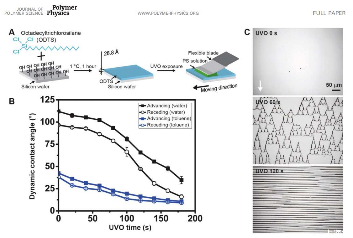 圖 1 (A) 制備具有可調(diào)表面能的基材然后應(yīng)用流涂工藝的示意圖。 (B) 動(dòng)態(tài) 接觸角包括作為 UVO 時(shí)間函數(shù)的基材的前進(jìn)(實(shí)心數(shù)據(jù)點(diǎn))和后退(開放數(shù)據(jù)點(diǎn))。 使用水(黑色數(shù)據(jù)點(diǎn))和甲苯(藍(lán)色數(shù)據(jù)點(diǎn))的液體。 誤差棒表示三個(gè)的標(biāo)準(zhǔn)偏差 獨(dú)立樣本。 (C) 在具有可調(diào)表面能的基材上制造的結(jié)構(gòu),從無沉積、超支化結(jié)構(gòu)到通過流涂的水平線。 此處使用的其他流涂參數(shù)是初始濃度 co,如 0.5 mg/mL,停止時(shí)間 t 為 100 ms,設(shè)置距離 d 為 5 lm。