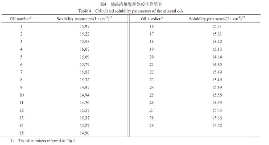 2)由擬合公式計算的11種有機溶劑的溶解度參數與文獻值的最大相對誤差為2.4%。29種常見的低芳淺色礦物油的溶解度參數計算值為14.40~16.07(J/cm3)1/2,與大部分石蠟基油和環烷基油的溶解度參數值相符,證明基于表面張力的溶解度參數擬合公式具有較好的準確性。