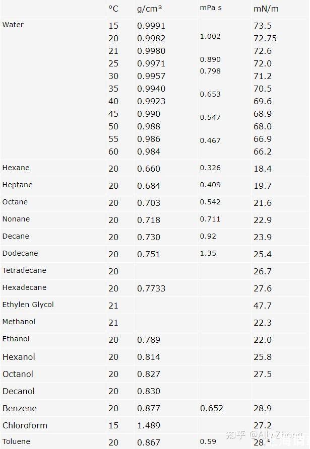 只有少數樣品可用于此類試驗測量。下表提供了一些此類液體的重要數據。這些數值由不同的作者和方法確定,可以作為標準。