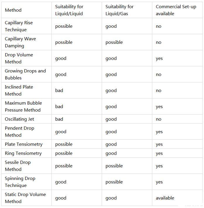 有些方法基于動力學原理,因此適合測量張力隨時間的變化。其他方法是靜態或準靜態方法,也產生動態張力,但也允許接近液體界面的平衡狀態,因此能夠測量平衡張力。動態方法需要考慮動態特性的數據解釋理論,而靜態方法的數據更容易理解。