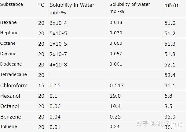 下表給出了兩種液體之間的界面張力值,兩種液體都是相互飽和的,以避免物質通過界面轉移造成的影響。注意,所有液體在第二種液體中都有一定的溶解度。室溫下的溶解度極限也在表3中給出。