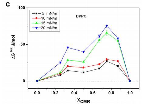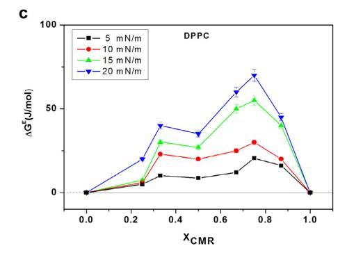 CMR/DPPG 混合膜的 ?Ge 和 ?Gmix 表示負 從 XCMR ≥ 0.25 到 XCMR = 1.0 的偏差(圖 7a 和 8a)。 ?Ge 和 ?Gmix 負值表明 CMR/DPPE 單層是 熱力學穩定(圖 7b)。 ?Ge 和 ?Gmix 值為 DPPC 混合單層陽性,表明不混溶 (圖 7c 和 8c)。 分子之間的距離取決于 在導致排斥的磷脂頭部基團上 互動(邁爾斯,1999 年;博格斯,1987 年)。
