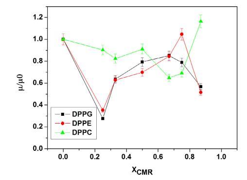 純和混合單層的 pA 等溫線與分子面積的關系如圖 1 所示。CMR/DPPG 等溫線顯示出與純 DPPG 脂質相似的趨勢(圖 1a)。 相似相 對所有 CMR/DPPG 混合物都觀察到了轉變。 DPPG 和 DPPC 顯示崩潰壓力 (DPcoll) 為 52 mN.m-1 次方和 60 mN.m-1次方 , 分別。 一個過渡 (p ffi 3 mN.m-1次方 ) 從液體 發現純 DPPE 單層膨脹為凝聚相 與 D. coll 在 ffi55 mN.m-1次方 . 為 D. coll 獲得的值 純脂質與文獻一致(Vollhardt 等人, 2000; 諾沃塔斯卡等人,2014 年)。