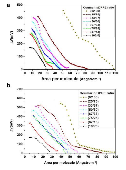 分子面積作為 CMR/ DPPG如圖5a所示。 可以看出負偏差 mma (XCMR = 0.33–0.67) 由于分子吸引力相互作用的增加。 CMR/DPPG 薄膜被認為是部分混溶和非理想的浮動單層,因為線性度不高 觀察到的。 CMR/DPPE 混合薄膜的結果在 XCMR=0.25 和 0.67 時表現出不同的斷裂點(圖 5b)。 DAE 節目 包裝效率甚至幾何形狀的改進 調節發生在較低的 XCMR(圖 6)(Andrade 等人, 2006; 周和張,2000)。