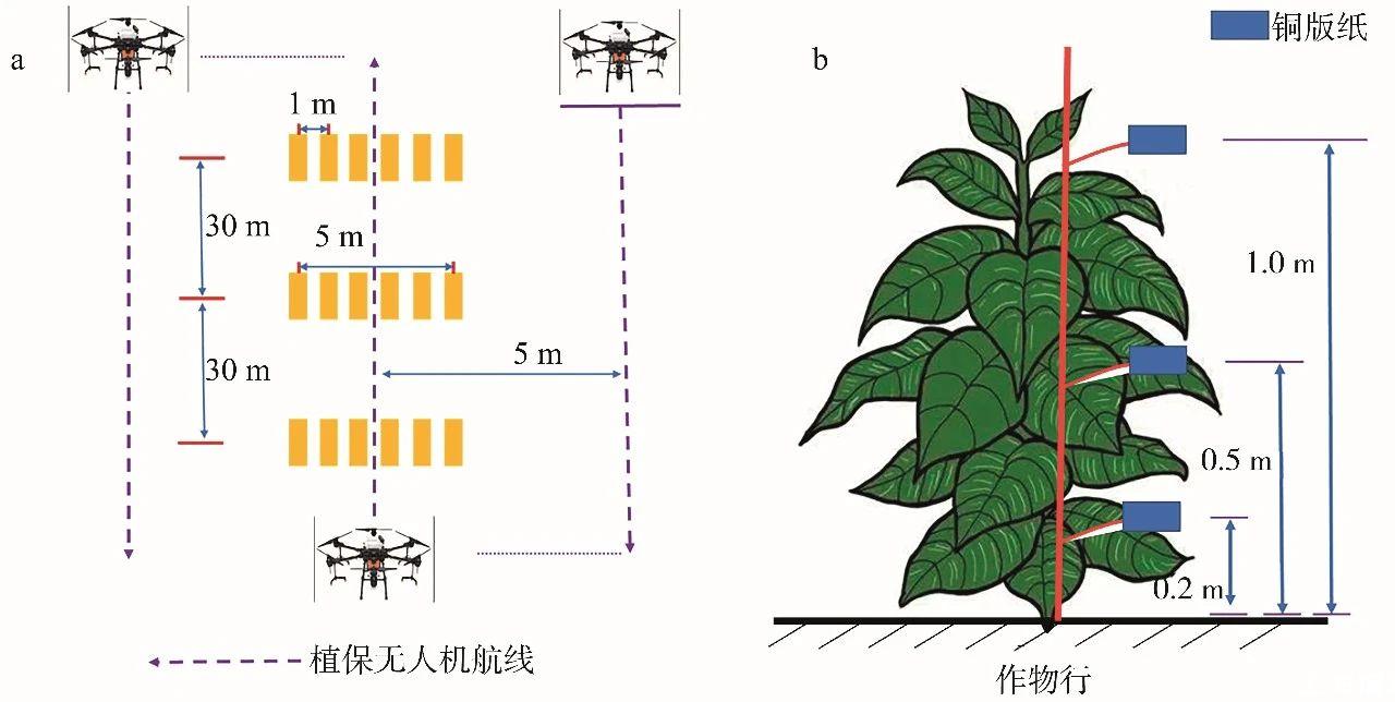 試驗時無人機采用常規往復施藥模式進行噴霧作業,各條航線之間間隔為5.0 m,試驗地塊開闊無遮擋,且煙草長勢較為一致。試驗前,在各處理小區中間地帶布置3排間隔為30.0 m的霧滴采集帶,每條霧滴采集帶含6個霧滴采集點,每個采集點間隔1.0 m,總長度5.0 m(圖1a)。每個霧滴采集點處插一根采樣桿,用雙頭夾將銅版紙固定在采樣桿上。設置上、中、下3層采樣位置,分別距地面1.0、0.5和0.2 m(圖1b)。用于測定煙草上、中、下冠層的霧滴密度和覆蓋率。噴霧結束后,待銅版紙上的霧滴自然晾干后收取并裝入自封袋帶回實驗室。