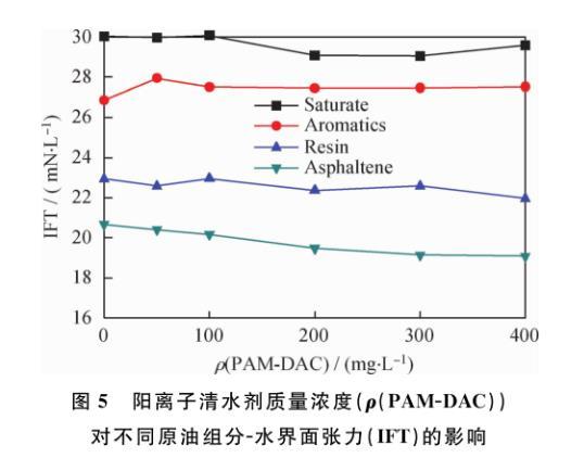 圖5陽離子清水劑質(zhì)量濃度(ρ(PAM-DAC))對不同原油組分-水界面張力(IFT)的影響