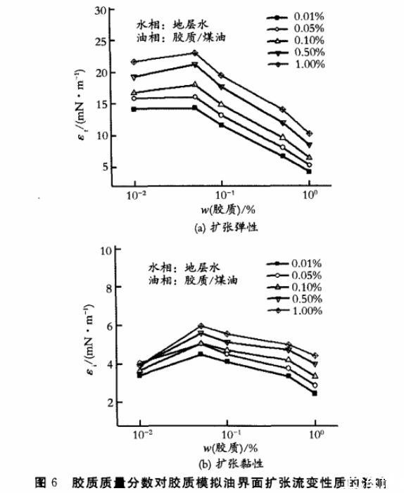 擴張頻率對不同質量分數(shù)膠質模擬油的界面擴張彈性和黏性的影響見圖4。從圖4中可以看出,隨著頻率降低,總體上擴張彈性和黏性均逐漸減小,說明膠質在油水界面形成的是黏彈膜。當界面變形速度較慢時,各種弛豫過程有足夠的時間去修復由界面面積變化帶來的界面張力梯度,因而擴張彈性和黏性均隨頻率的降低而減小。