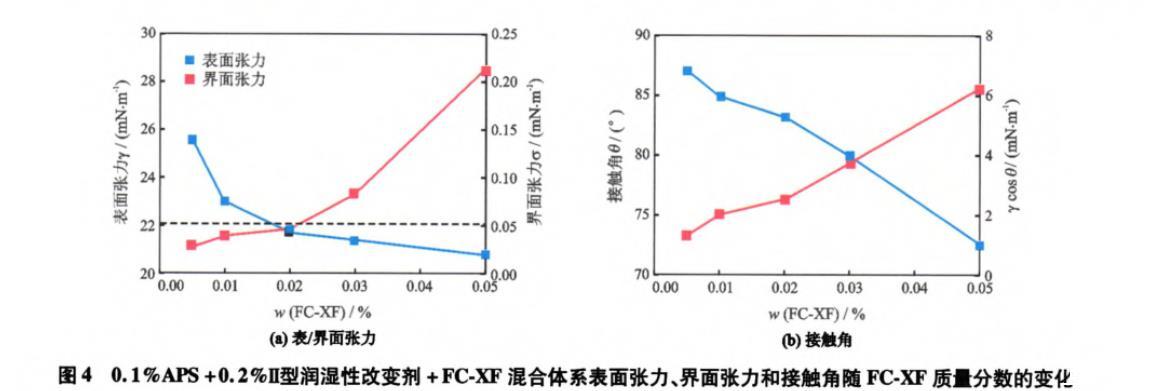 從圖4(b)中可以看出,隨著FC-XF質量分數由0.005%增加到0.050%,混合體系與巖石的接觸角由87°降低至73°,γcosθ由1.3 mN/m上升到6.3 mN/m。這是由于吸附Ⅱ型潤濕性改變劑和APS使得巖石表面由水濕轉變為中性潤濕(接觸角>87°),更易于吸附FC-XF的碳氟鏈而使親水性頭基在巖石表面暴露,增加了巖石表面的親水性,因而隨著FC-XF質量分數的增加接觸角減小。