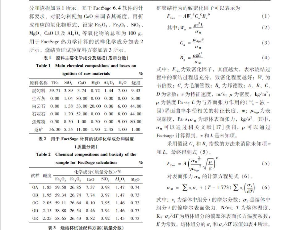 在燒結過程中,熔體的形成十分復雜,不可能直接測量熔體的物理性能,因此可以通過熔體成分來預測熔體的性能。液相聚結使得燒結礦孔表面積減少,通常認為聚結行為受表面力、黏性力、慣性力和重力的綜合結果。因此,評估燒結礦聚結行為的致密化因子可以表示為: