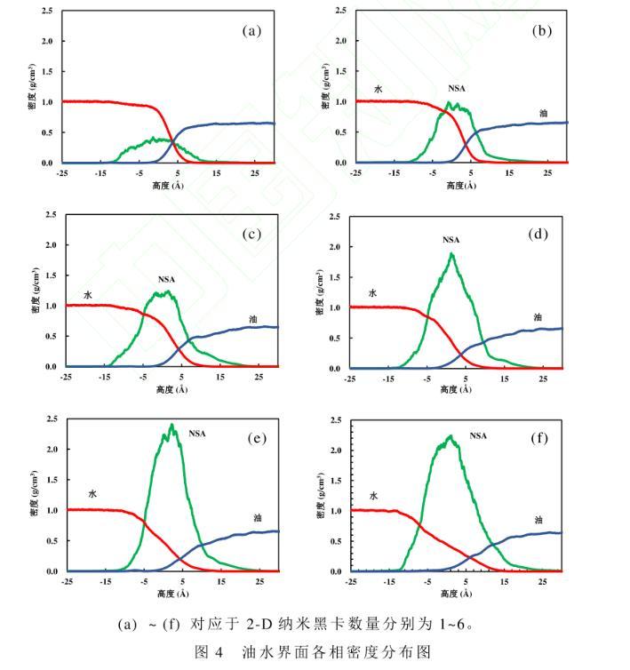 運(yùn)用所構(gòu)建的油水界面模型,研究2-D納米黑卡(NSA)在油水界面的密度分布及吸附行為,模擬結(jié)果如圖4所示。納米黑卡數(shù)量增加時(shí),界面處油相密度變化幅度大。這是由于隨著納米黑卡數(shù)量的增加,接枝的直鏈烷烴與油相相互作用不斷增強(qiáng)所致。當(dāng)體系達(dá)到平衡狀態(tài),納米片大部分浸沒在水相中,直鏈烷烴主要浸沒在油相中。此時(shí),納米黑卡所處的平衡位置受到納米黑卡重力和分子間相互作用力的影響很大,分子間相互作用力包括范德華力和靜電力。納米片偏親油性,顯示出與油水分子間的弱范德華力,而直鏈烷烴與油相分子間存在強(qiáng)范德華力,因此納米片被拉向油相。隨著納米黑卡數(shù)量的增加,油水界面納米片的密度隨之增加。納米黑卡的密度在中線附近出現(xiàn)峰值,當(dāng)納米黑卡數(shù)量增至4片后繼續(xù)增加黑卡數(shù)量,在中線部分納米黑卡的密度增加量并不明顯,只是高峰變寬了。