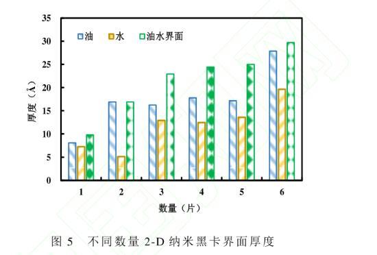 假設(shè)2-D納米黑卡全部平鋪在油水界面,其表面積與油水界面面積的比值即為界面覆蓋率(RIC)。不同數(shù)量的納米黑卡在油水體系中的界面覆蓋率和界面厚度見圖6。界面覆蓋率與界面厚度隨著納米黑卡數(shù)量的增加逐漸增加,且界面覆蓋率呈指數(shù)增加,而界面厚度呈對(duì)數(shù)增加,納米黑卡數(shù)量由1增至6時(shí),界面覆蓋率分別為0.16、0.31、0.46、0.91、1.34和2.64。當(dāng)納米黑卡數(shù)量增加到一定程度時(shí)(納米黑卡數(shù)量為4片),油水界面幾乎全部被覆蓋,界面覆蓋率在1左右,此時(shí)的界面厚度達(dá)到相對(duì)穩(wěn)定的狀態(tài),界面呈單層且平鋪吸附狀態(tài);當(dāng)黑卡數(shù)量繼續(xù)增加,界面覆蓋率指數(shù)增加,界面厚度也隨之增加,此時(shí)納米片呈受擠壓狀態(tài),出現(xiàn)褶皺態(tài)和重疊疊加態(tài),繼續(xù)增加納米黑卡數(shù)量,界面達(dá)到飽和,界面厚度不再增加,多出的黑卡分散在水溶液中,由于黑卡本身存在弱范德華相互作用,片片間不斷疊加,成為團(tuán)聚態(tài),從而形成沉淀。該沉淀物質(zhì)以弱范德華相互作用團(tuán)聚在一起,當(dāng)遇到剪切、稀釋、振蕩等外界作用時(shí)會(huì)重新分散在水溶液中,發(fā)揮其單片的作用。