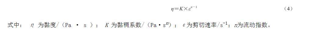 式中:η為黏度/(Pa·s);K為黏稠系數/(Pa·sn);ε為剪切速率/s-1;n為流動指數。