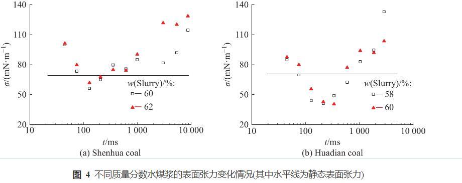 表面張力是作用于液體表面,使液體表面積縮小的力,在液體破裂過程中發揮了重要影響。在液體破裂過程中,純液體的表面張力為常數,而表面活性劑溶液的表面張力為變量,一般稱為動態表面張力,其數值與表面活性劑種類、濃度和界面變形速率等參數相關。對于水煤漿等含添加劑的復雜液固混合物漿體,其動態表面張力更加復雜。