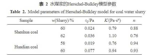 表2水煤漿的Herschel-Bulkley模型參數