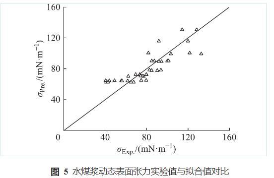 圖5水煤漿動態表面張力實驗值與擬合值對比