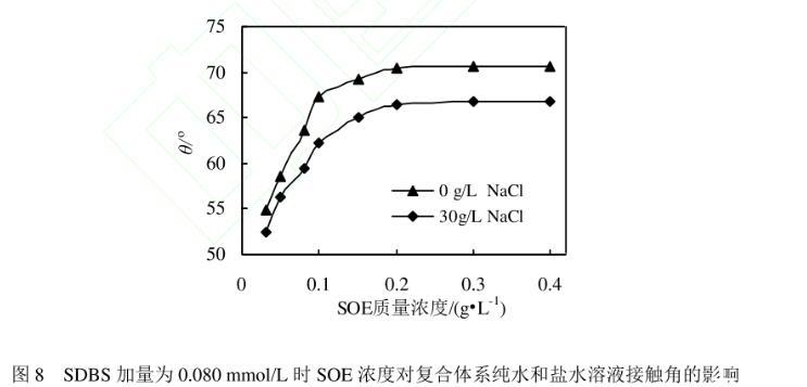 圖8 SDBS加量為0.080 mmol/L時SOE濃度對復合體系純水和鹽水溶液接觸角的影響