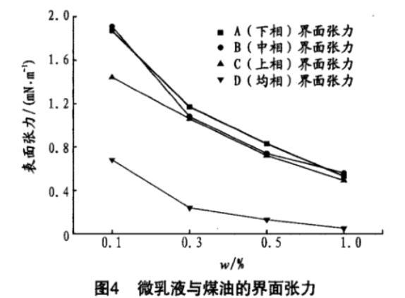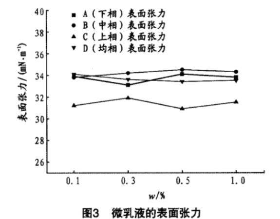 對(duì)上述微乳液進(jìn)行了表/界面張力的測(cè)試,結(jié)果見(jiàn)圖3。