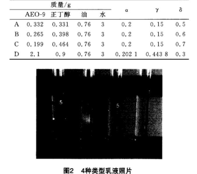 由圖1可見(jiàn),在所配制的乳液中,既有均相乳液,也有兩相(上相、下相)乳液,同時(shí)有三相(中相)乳液。在選擇典型體系時(shí),應(yīng)體現(xiàn)出全面性,即以上4種類(lèi)型乳液都涉及到,同時(shí)應(yīng)考慮到漸變性,即固定某個(gè)變量(此處固定γ),一種相態(tài)向另一種相態(tài)轉(zhuǎn)變。由此,選出其中4組:A(下相乳液)、B(中相乳液)、C(上相乳液)、D(均相乳液),A、B、C、D的組成如表1所示,形成的乳液照片如圖2所示。分別將乳液部分分離出來(lái),稀釋成質(zhì)量分?jǐn)?shù)為0.1%、0.3%、0.5%、1.0%的微乳液。
