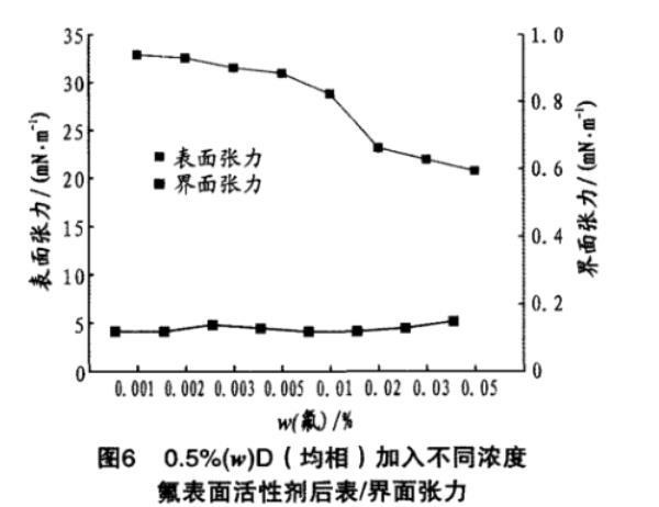 0.5%(w)D(均相)加入不同濃度氟表面活性劑后表/界面張力見(jiàn)圖6。