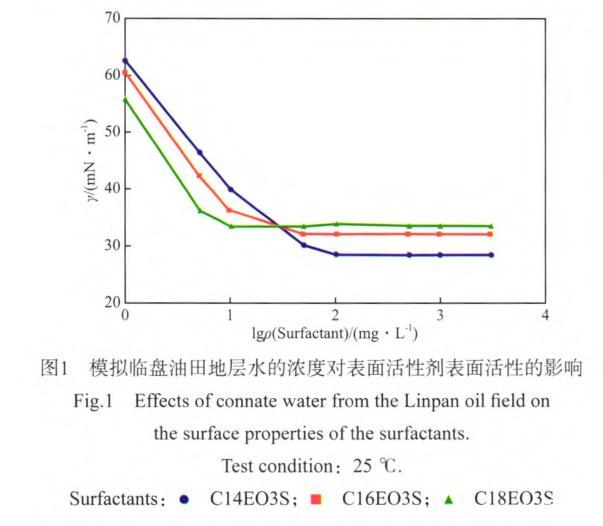 使用模擬臨盤油田地層水將表面活性劑配制成溶液,考察油田地層水對表面活性劑表面活性的影響,實驗結果見圖1。由圖1可看出,在該油田地層水中,C14EO3S,C16EO3S,C18EO3S的cmc依次為80,40,10 mg/L,其所對應的γcmc分別為28.86,32.38,33.75 mN/m。與C14EO3S在蒸餾水中的cmc相比,C14EO3S在油田地層水的cmc降低了20 mg/L。由文獻[1]的報道可知,在該油田地層水中,C14EO6S,C16EO6S,C18EO6S表面活性劑的cmc依次為100,50,50 mg/L,其所對應的γcmc分別為29.14,36.74,34.65 mN/m。實驗結果表明,隨EO數(shù)的增加,脂肪醇聚氧乙烯醚磺酸鹽表面活性劑在油田地層水中的cmc和其所對應的γcmc均有不同程度的增大。
