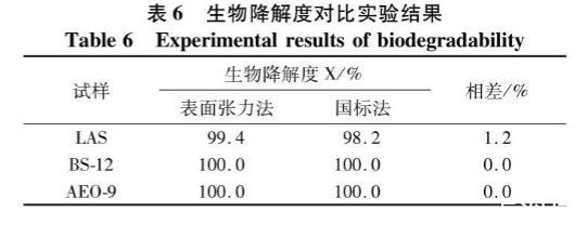 對比兩種方法得出的生物降解度,由表6可知,表面張力法計算得出的生物降解度比國標法測定的結果偏高或者一致,兩者相差小于2%,可認為兩種方法均可測定表面活性劑的生物降解度,其結果均可信。