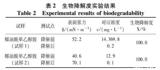 不同批次的椰油酰單乙醇胺試樣經過降解后利用表面張力法測定其降解液的表面張力值,根據生物降解度公式計算得出降解度,測定結果見表2。其中空白降解試驗液降解前與降解后的表面張力值分別是69.5、68.2mN/m,而試樣溶液在降解后測定的表面張力值均大于空白降解試驗液降解后的表面張力值68.2mN/m,導致帶人工作曲線計算出的降解后試樣溶液的濃度(c終)小于降解后空白降解試驗液的濃度(c空),根據公式要求,當c終小于C空時,差值以零計,因此最終計算出的生物降解度為100.0%。