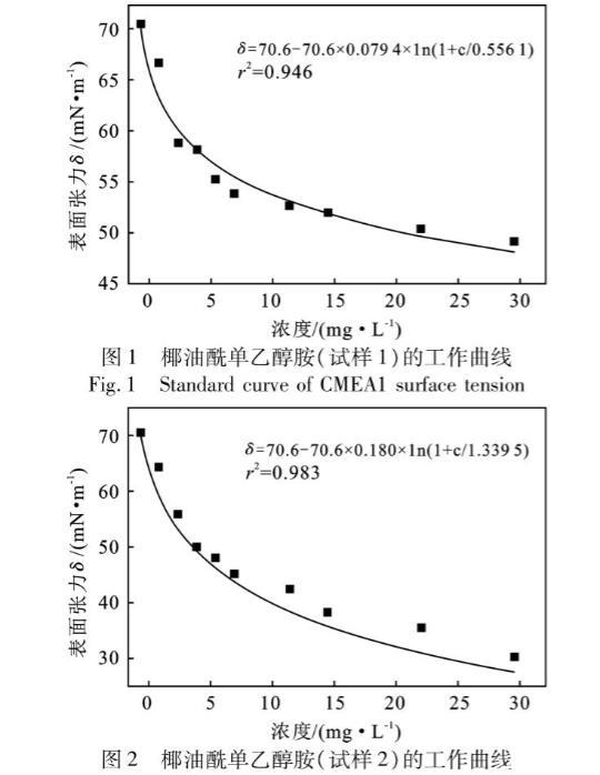 選擇2個不同批次的椰油酰單乙醇胺試樣按照工作曲線的繪制方法繪制表面張力工作曲線。通過測定不同濃度的椰油酰單乙醇胺溶液的表面張力,制作濃度和表面張力的c-8的散點圖,再根據希斯科夫斯基經驗公式利用Origin軟件做c-8散點圖的擬合曲線,得到該公式的相關參數,得出擬合公式及工作曲線。