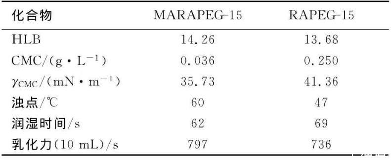 按文獻(xiàn)方法測定MARAPEG-15和RAPEG-15的HLB值、濁點(diǎn)、乳化力、潤濕力(采用國標(biāo)GB/T 11983-89)、吸濕性能、保濕性能、表面張力和臨界膠束濃度(最大泡壓法)。
