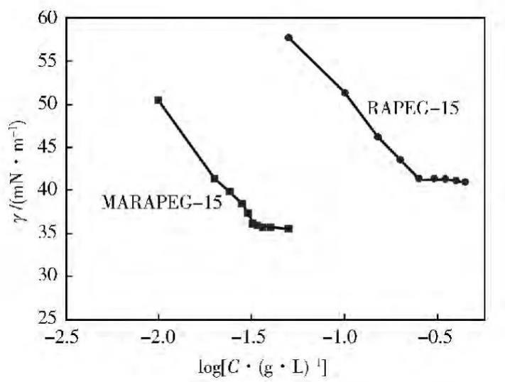 圖2是MARAPEG-15和RAPEG-15的表面張力(γ)和濃度(C)的關(guān)系。表1是MARAPEG-15和RAPEG-15的表面性能。