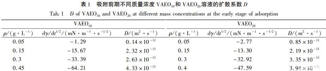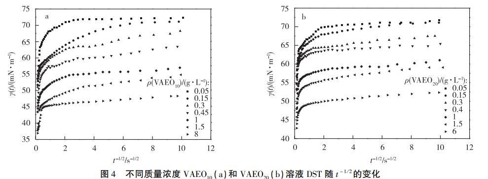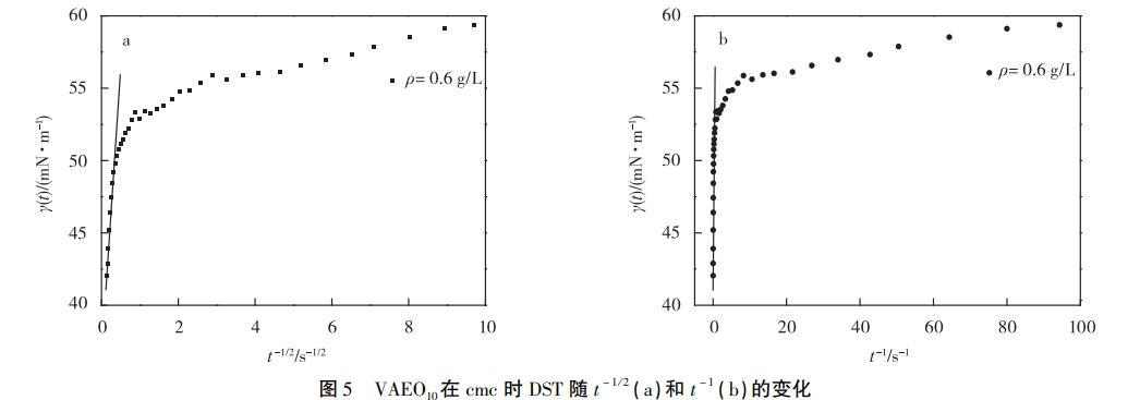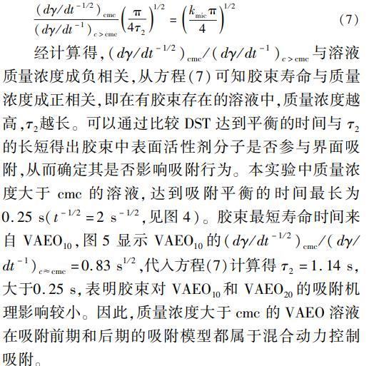 經計算得,(dγ/dt-1/2)cmc/(dγ/dt-1)c>cmc與溶液質量濃度成負相關,從方程(7)可知膠束壽命與質量濃度成正相關,即在有膠束存在的溶液中,質量濃度越高,τ2越長。可以通過比較DST達到平衡的時間與τ2的長短得出膠束中表面活性劑分子是否參與界面吸附,從而確定其是否影響吸附行為。本實驗中質量濃度大于cmc的溶液,達到吸附平衡的時間最長為0.25s(t-1/2=2s-1/2,見圖4)。膠束最短壽命時間來自VAEO10,圖5顯示VAEO10的(dγ/dt-1/2)cmc/(dγ/dt-1)c≈cmc=0.83s1/2,代入方程(7)計算得τ2=1.14s,大于0.25s,表明膠束對VAEO10和VAEO20的吸附機理影響較小。因此,質量濃度大于cmc的VAEO溶液在吸附前期和后期的吸附模型都屬于混合動力控制吸附。