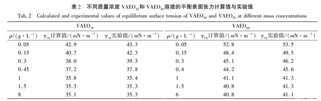 從以上對VAEO10和VAEO20在氣/液界面的吸附行為的研究可知,當質量濃度小于cmc時,二者在吸附前期均表現為擴散控制吸附,擴散系數D的數量級為10-11m2/s,在吸附后期均為混合動力控制吸附,表觀擴散系數Da的數量級為10-12m2/s.膠束存在時,τ2較長,大于到達γeq所需時間teq,膠束形成不影響表面張力隨時間的變化趨勢。據文獻報道,壬基酚聚氧乙烯醚(NPEO9)濃度小于cmc時的擴散系數為3.9×10-10m2/s(滴體積法),平衡表面張力為30.6mN/m,可推測NPEO10的擴散系數在3.9×10-10m2/s附近,大于本研究中VAEO10的擴散系數。VAEO的疏水部分分子結構比NPEO的大,前者較后者多一個縮醛環和一個甲氧基,這兩個基團一方面造成VAEO的空間體積較大,另一方面,縮醛環中的——O-與水分子可能形成氫鍵,均增加了VAEO擴散時的阻力,因而降低了擴散速率。