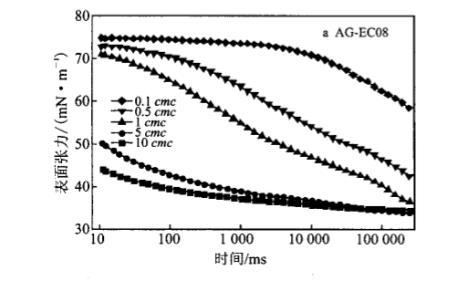 2.2.1烷基糖苷檸檬酸單酯二鈉鹽的烷基鏈長對其水溶液動態表面張力的影響圖3為不同烷基鏈長的AG-EC水溶液(2.26mmoL/L)的DST隨時間變化的情況。