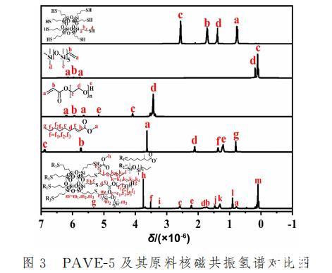 采用核磁共振氫譜對(duì)所制備復(fù)合材料的化學(xué)結(jié)構(gòu)進(jìn)一步表征分析。圖3為PAVE-5以及其原料的核磁共振對(duì)比圖。PAVE-5譜圖中,SH-POSS的-SH質(zhì)子氫吸收峰已經(jīng)消失,接枝成功的APEG400烯烴雙鍵的質(zhì)子氫吸收峰已經(jīng)明顯消失,末端連接的-OH質(zhì)子氫吸收峰在5.32x10-6處;同樣反應(yīng)成功的2-壬烯酸甲酯單體,烯烴雙鍵的質(zhì)子氫吸收峰也同樣消失不見,連接O的末端烷烴-CH3質(zhì)子氫吸收峰處于3.75x 10-6的位置;最后成功反應(yīng)的VDMS單體,烯烴雙鍵的質(zhì)子氫吸收峰也已經(jīng)消失,Si上連接的所有甲基CH3分別處在0.09x10-6和0.14x10-6處,可以得知PAVE-5成功合成。