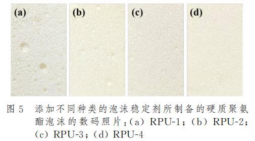 泡沫穩(wěn)定劑的存在對(duì)于硬質(zhì)聚氨酯泡沫性能影響在宏觀上有著十分顯著的體現(xiàn)。圖5是添加不同種類的泡沫穩(wěn)定劑后制樣得到的硬質(zhì)聚氨酯泡沫橫截面的數(shù)碼照片。結(jié)果表明,接枝APEG鏈段的PAVE-5和PGVF-6泡沫穩(wěn)定劑所制備的聚氨酯泡沫RPU-3和RPU-4,其泡孔結(jié)構(gòu)相較于市售產(chǎn)品所制備的聚氨酯泡沫展現(xiàn)出了更加細(xì)膩均勻的泡孔結(jié)構(gòu),而市售產(chǎn)品所形成的泡沫則表現(xiàn)出較為粗糙且孔徑不均勻的泡孔結(jié)構(gòu)。這表明親水結(jié)構(gòu)有利于泡沫穩(wěn)定劑均勻分散在多元醇中并使得反應(yīng)充分進(jìn)行,泡孔尺寸細(xì)小致密,有利于改善硬質(zhì)聚氨酯泡沫的壓縮性能。