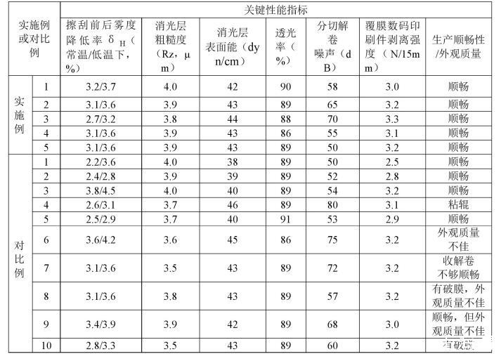 從實施例1~實施例5的數(shù)據(jù)可知,本發(fā)明的耐擦刮無膠消光膜在常溫和低溫環(huán)境下均具有良好的耐擦刮性能,實現(xiàn)了消光層表面在耐擦刮性、高表面張力(與印刷適性正相關(guān))與收解卷順暢性的平衡。其中實施例4中球體抗粘連劑為球體聚硅氧烷,雖然制得的薄膜的透光率相比實施例2有所下降,但是薄膜的分切解卷噪聲降低明顯,總體性能是符合本申請要達(dá)到的目標(biāo)的。實施例5中,在熱復(fù)合層中加入了適宜熔融指數(shù)的高密度聚乙烯,其制備的耐擦刮無膠消光膜表現(xiàn)出更低的分切解卷噪聲,解卷順暢性更好,且未對薄膜的透光率和熱復(fù)合層與印刷件之間的剝離強度產(chǎn)生不良影響。