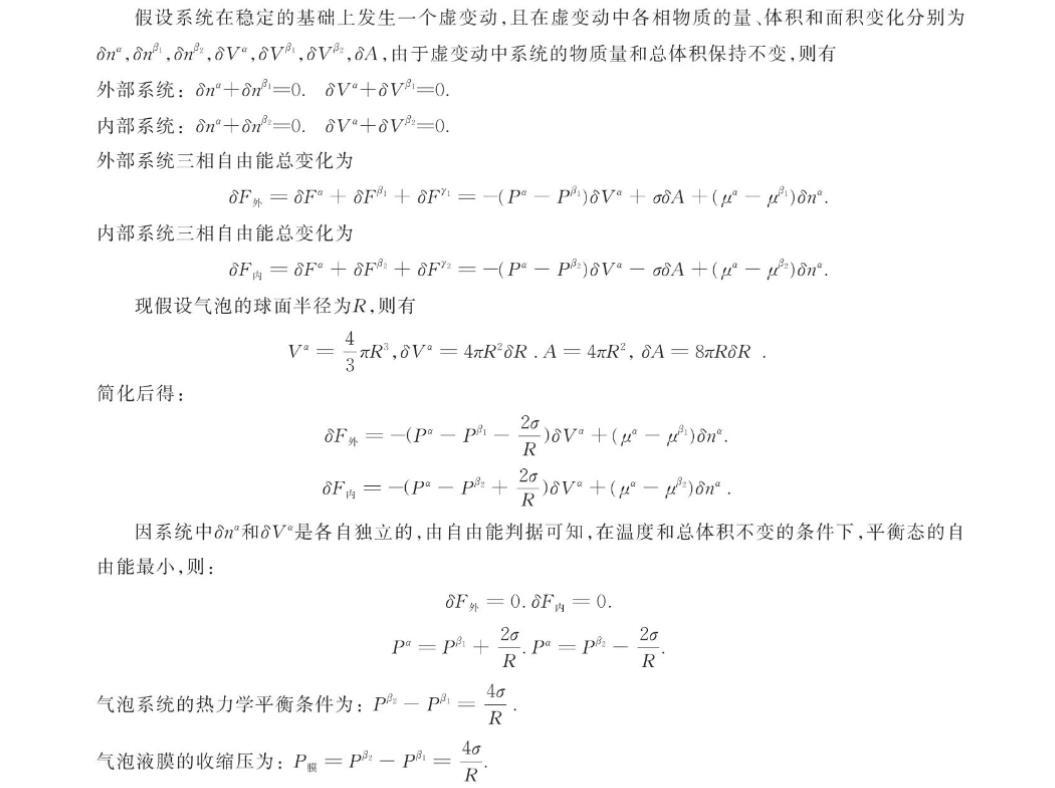 設氣泡穩定時液膜為α相,泡外蒸汽為β相,泡內蒸汽為β2相,泡外表面為相,泡內表面為2相.若將氣泡表面理想化為標準球面,則表面相的物質量n"=n=0.當氣泡穩定后系統滿足熱平衡條