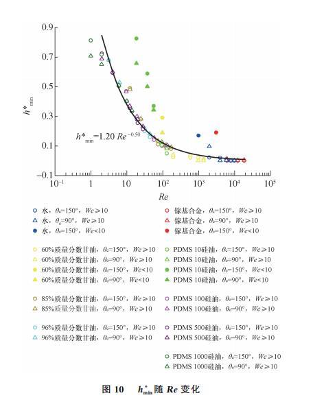 此外,當Re接近于1時,hmin明顯偏離hmin∝Re-0.5規(guī)律,其原因與上文所述一致,即高黏度液滴低速碰撞壁面時,液滴更多的表現(xiàn)出自然鋪展特性。