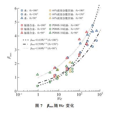 本文在毛細力區(qū)研究的流體包括水、60%質(zhì)量分數(shù)甘油溶液、PDMS10硅油和鎵基合金,βmax隨We變化的情況如圖7所示。對不同潤濕性壁面的模擬結果進行擬合,如圖7中虛線所示:當θe=90°時,βmax∝We0.26(R2=0.921);當θe=180°時,βmax∝We0.40(R2=0.990);當θe=150°時,βmax∝We0.29(R2=0.918),介于前兩者之間。因為真實表面無法絕對疏水,所以Clanet等實驗研究結果βmax∝We0.25更接近本文θe=90°的模擬結果,而Eggers等針對完全疏水表面提出的βmax∝We0.5更適用于θe=180°的情況。